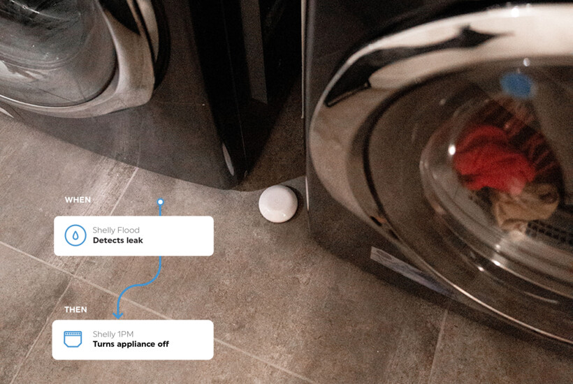 Shelly Flood sensor can prevent potential threats, including equipment damage by simply placing the smart sensor close to your connected appliances, like dryers, refrigerators, or washing machines. If Shelly Flood detects any leaks, it will immediately trigger Shelly Plus 1PM to cut off the power supply of the socket, preventing potential threats.