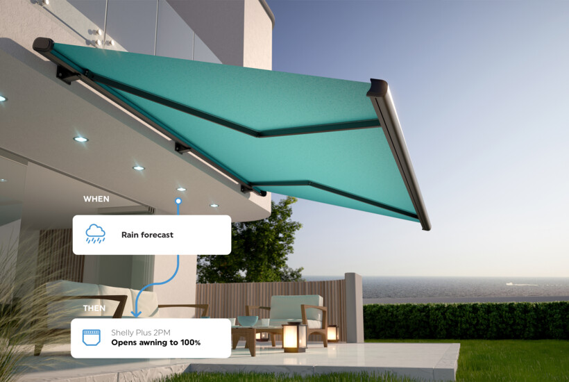 The outdoor motorized awnings offer pleasant shade for the establishment visitors on sunny days. However, a strong, unexcepted wind can damage them beyond repair. By combining it with a wind sensor or simply by using a script to receive data for the weather forecast, Shelly Plus 2PM can automatically close the outside awnings to protect them from the wind. Additionally, if the weather forecast predicts rain in the afternoon hours, Shelly will open the awnings again to protect the outside seated customers.